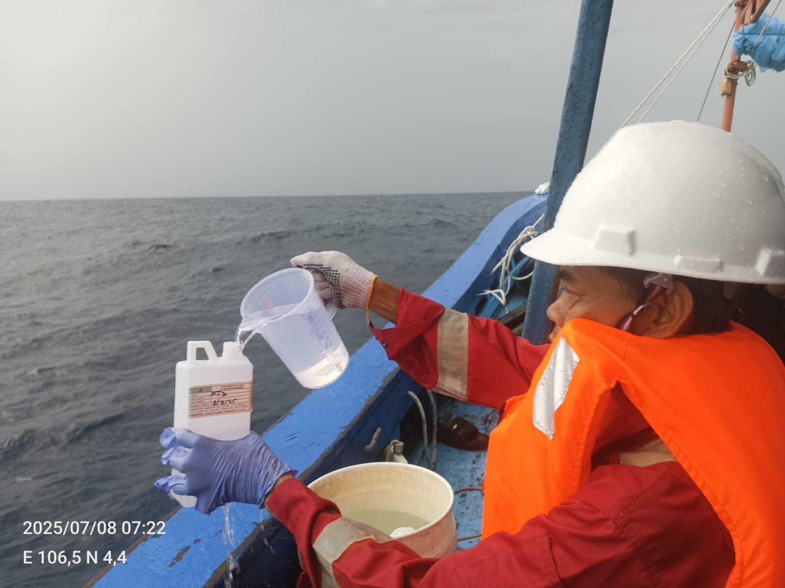Pemantauan lingkungan dilakukan dengan metode pengamatan visual dan pengambilan sampel air laut di sekitar area pengeboran. Sampel diambil pada saat pasang dan surut di dua titik berbeda, untuk memastikan representasi kondisi yang akurat.