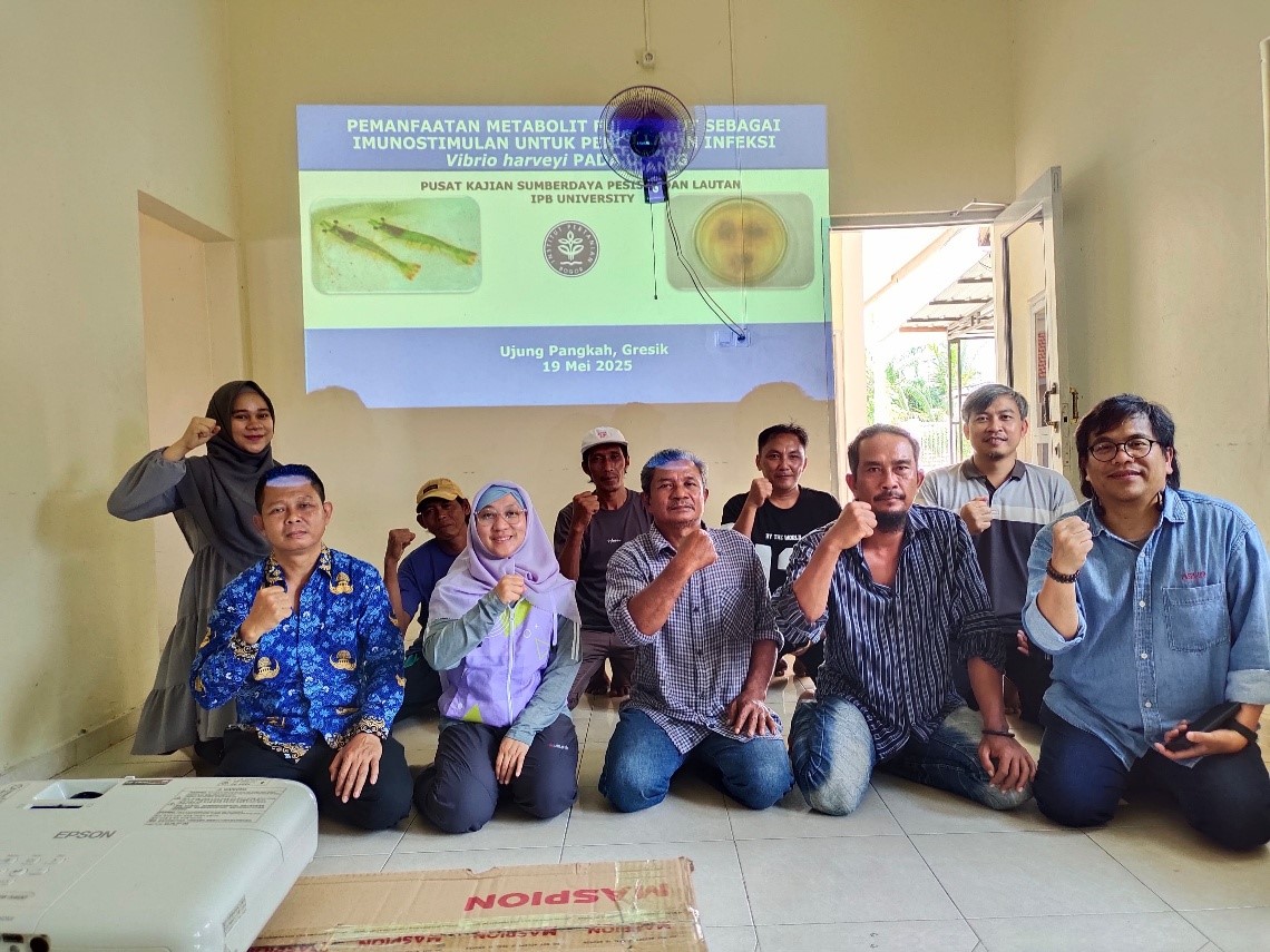Diketahui bahwa pada tahun 2024, produksi udang di Ujung Pangkah mengalami penurunan signifikan yang diperparah oleh pembatasan penggunaan antibiotik dalam budidaya. Hal ini mendorong PKSPL IPB untuk menggali potensi lokal yang berkelanjutan, khususnya dari vegetasi mangrove, dalam upaya pengendalian penyakit udang yang ramah lingkungan.