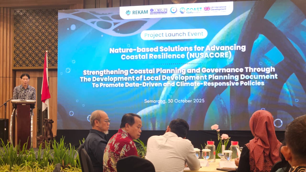 Di penghujung acara, Yayasan REKAM Nusantara dan Pusat Kajian Sumberdaya Pesisir dan Lautan (PKSPL) IPB University menguraikan kesiapan implementasi proyek, prioritas kegiatan NUSACORE, serta mekanisme pendanaan program berbasis hibah dari Pemerintah Inggris. Dialog berjalan konstruktif, memberikan ruang bagi peserta untuk mengusulkan kegiatan eligible, memetakan tantangan, serta menegaskan dukungan lintas sektor terhadap upaya adaptasi dan transisi berkelanjutan kawasan pesisir Indonesia.