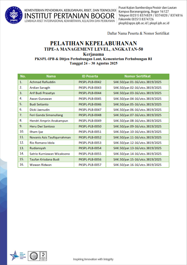 Sertifikat Pelatihan Kepelabuhan Tipe-A Management Level, A-50